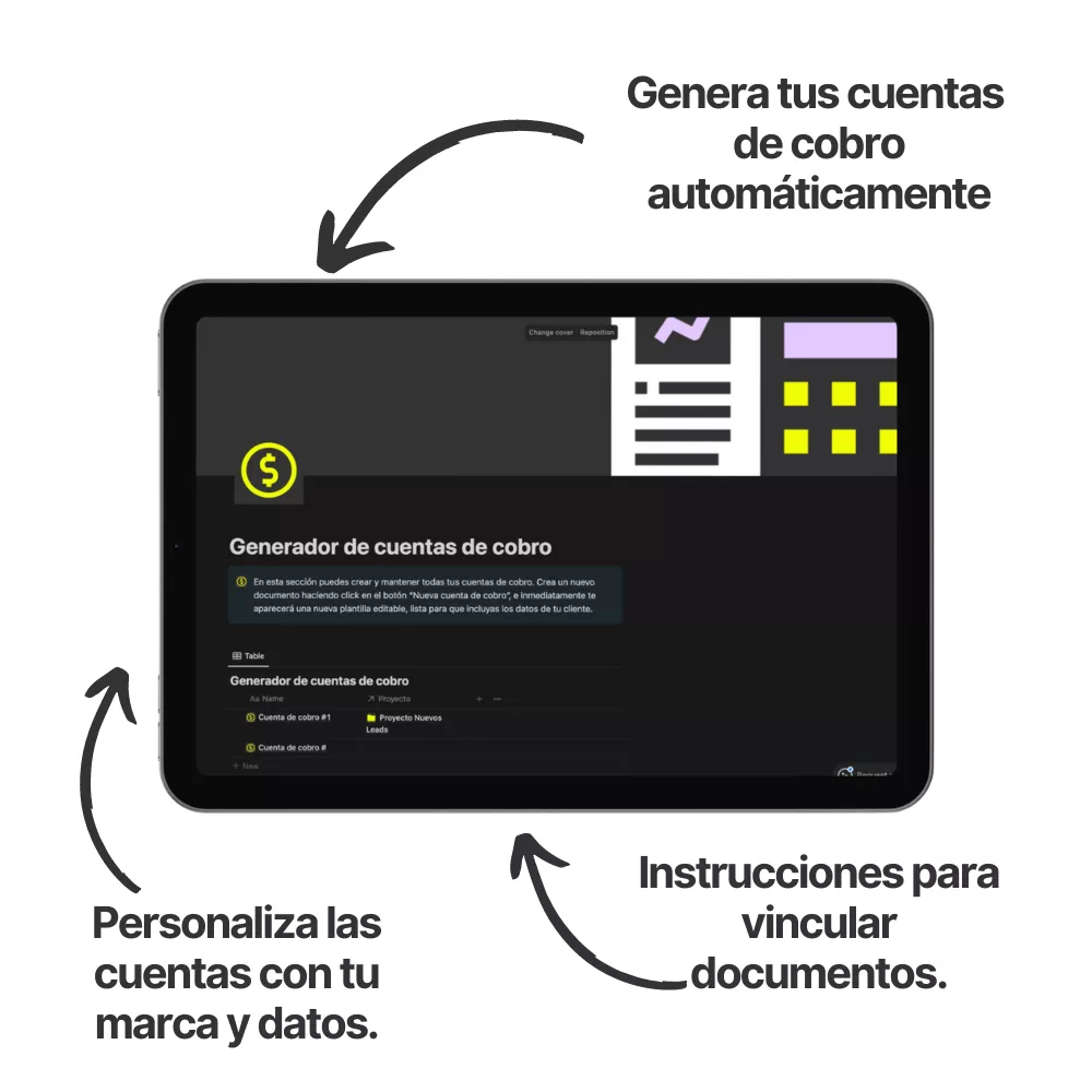 Generador automático de cuentas de cobro: vinculado a las bases de datos de clientes y proyectos, este bonus te permite generar automáticamente cuentas de cobro para tus proyectos. Ahorra tiempo y evita errores con este práctico recurso.