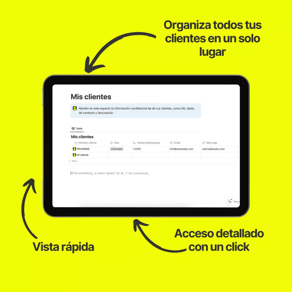 Organizador de clientes: pueden ser internos o externos. Si trabajas por tu cuenta, serán las empresas y personas que te contratan; si trabajas en una empresa, pueden ser las áreas y personas con las que intervienes; si estudias, serán tus profesores o materias. Se trata de un espacio para llevar los detalles de las personas o empresas con las que trabajas, y en donde puedes alojar desde detalles de contratos y financieros, hasta preferencias personales. Si a este cliente le gusta tener reuniones semanales y le encanta que le envíes correos con emojies, acá tendrás espacio para visibilizar esos detalles que, al final, te convierten en la opción ideal de ese cliente.