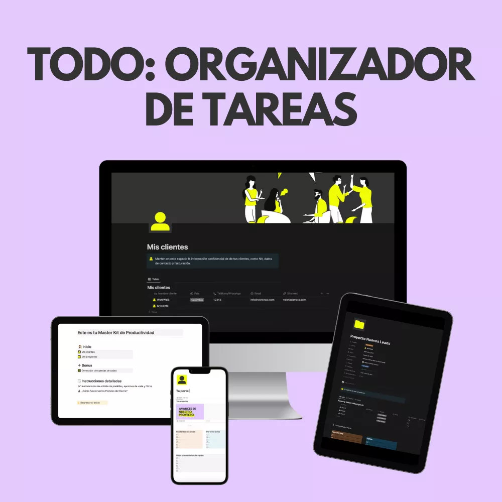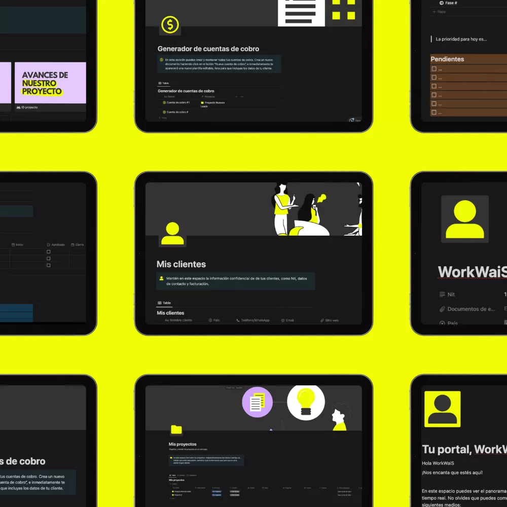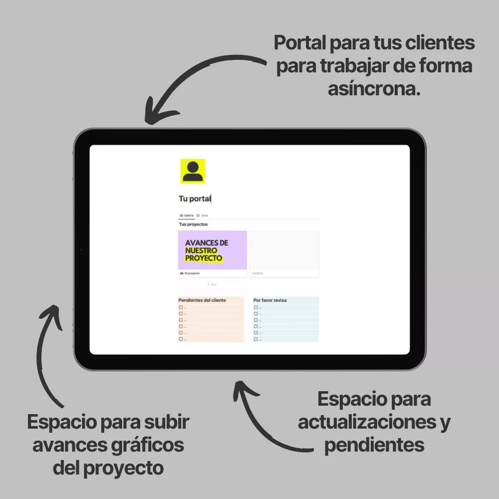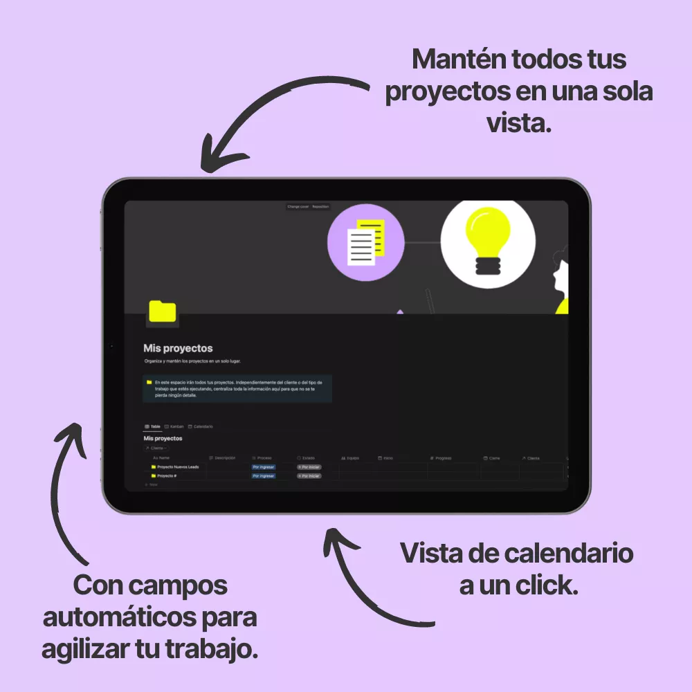 Este kit de plantillas automatizadas de Notion te permite ordenar definitivamente tu negocio y tener control de tus proyectos. Mantiene la información de clientes y proyectos a la vista, vincula las bases de datos para asegurar una trazabilidad impecable, tiene un portal del cliente para que lo mantengas al tanto de los avances y trabajen de manera asíncrona sin necesidad de enviar y recibir correos, e incluye como bonus un generador automático de cuentas de cobro para simplificar su creación con apenas un par de clicks.